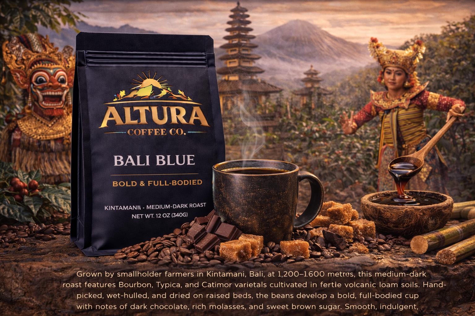 Grown by smallholder farmers in Kintamani, Bali, at 1,200–1,600 meters, this medium-dark roast features Bourbon, Typica, and Catimor varietals cultivated in fertile volcanic loam soils. Hand-picked, wet-hulled, and dried on raised beds, the beans develop a bold, full-bodied cup with notes of dark chocolate, rich molasses, and sweet brown sugar. Smooth, indulgent, and deeply satisfying, it’s a coffee that embodies the vibrant character of Bali’s highlands.
